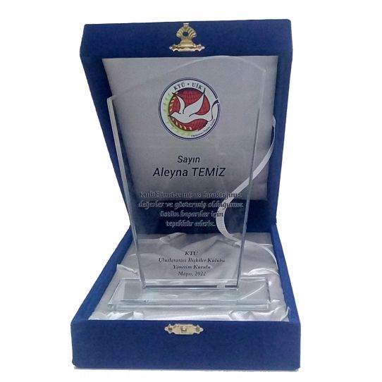 Kadife kutu içerisinde 10 mm kalınlığında şeffaf ya da beyaz boyanmış kristale sublimasyon baskı, tranfer baskı veya UV baskı tekniği ile kişiye özel