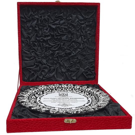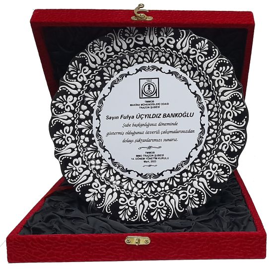 Sert metal malzemeden üretilmiş olan plaketin orta kısmına monte edilen metale sublimasyon tekniği ile baskılar yapılmaktadır. Plastik ayak ile birlikte masa üzerinde kullanılabilir. İsteğe göre kadife kutusu ile birlikte de alınabilir.
